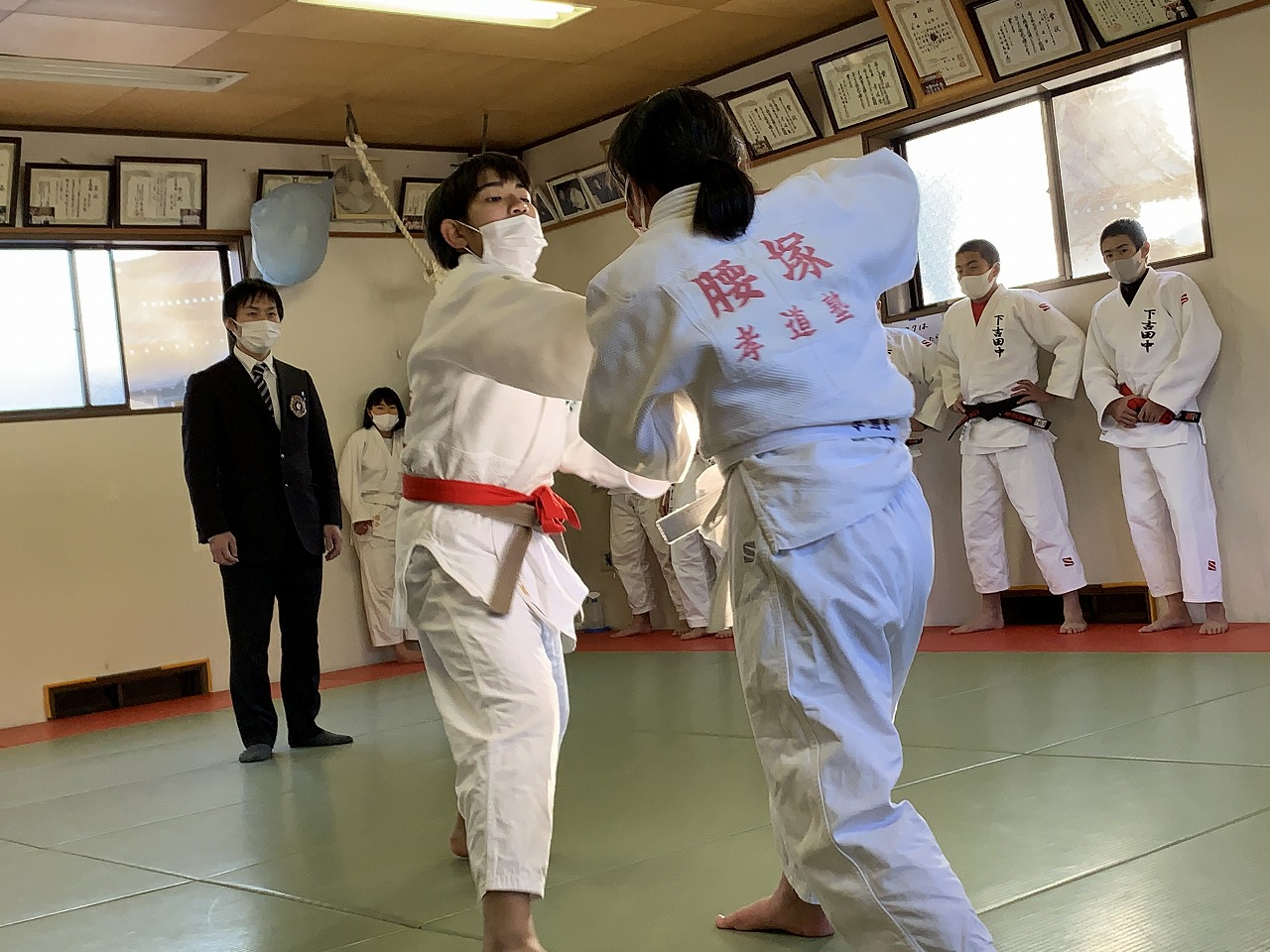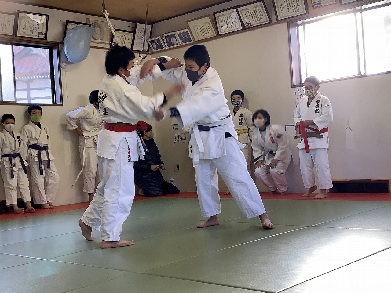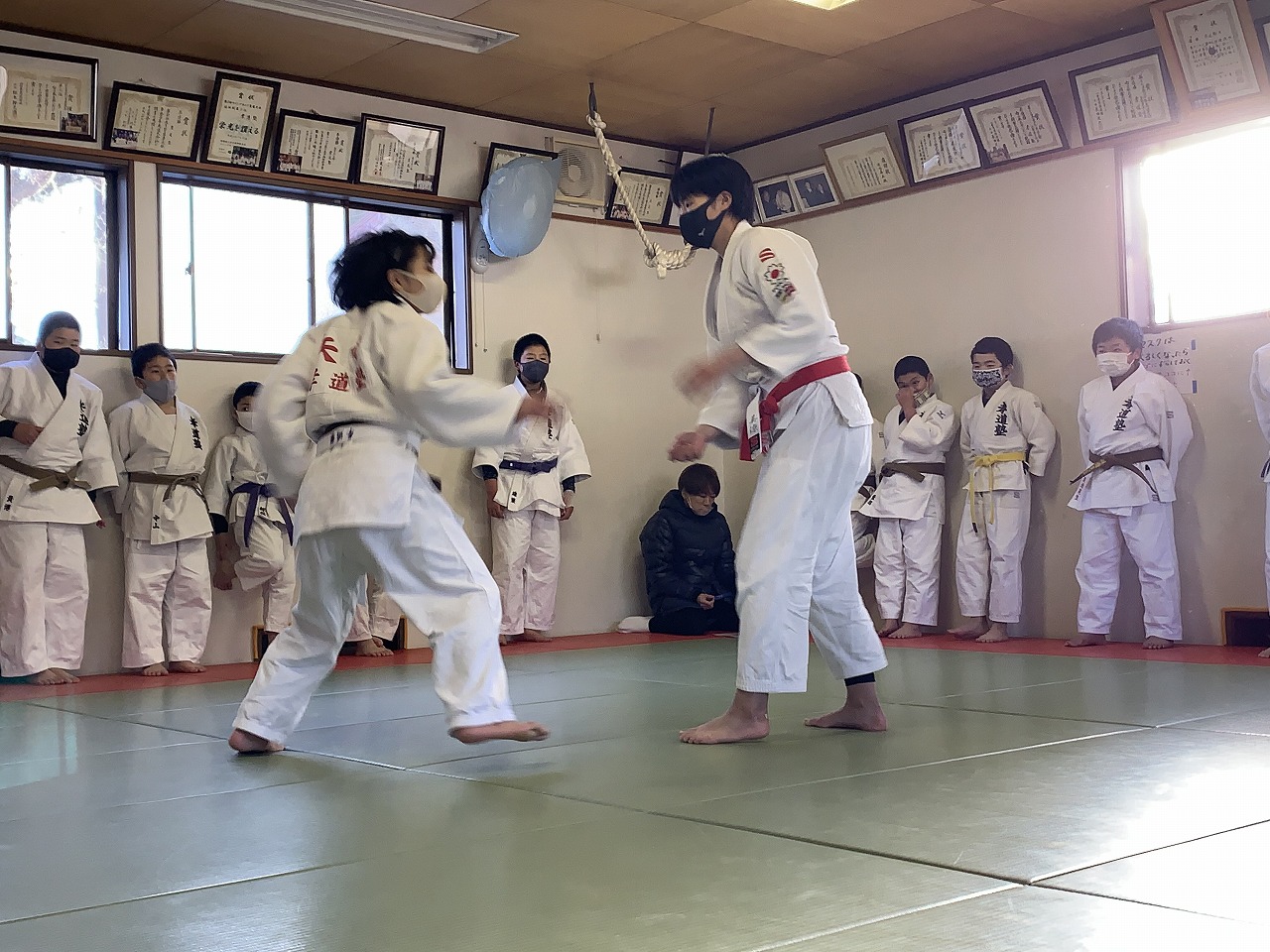 学年別に待機し、少人数で道場に入り試合開始。低学年から一試合づつ行い、試合ごとの消毒