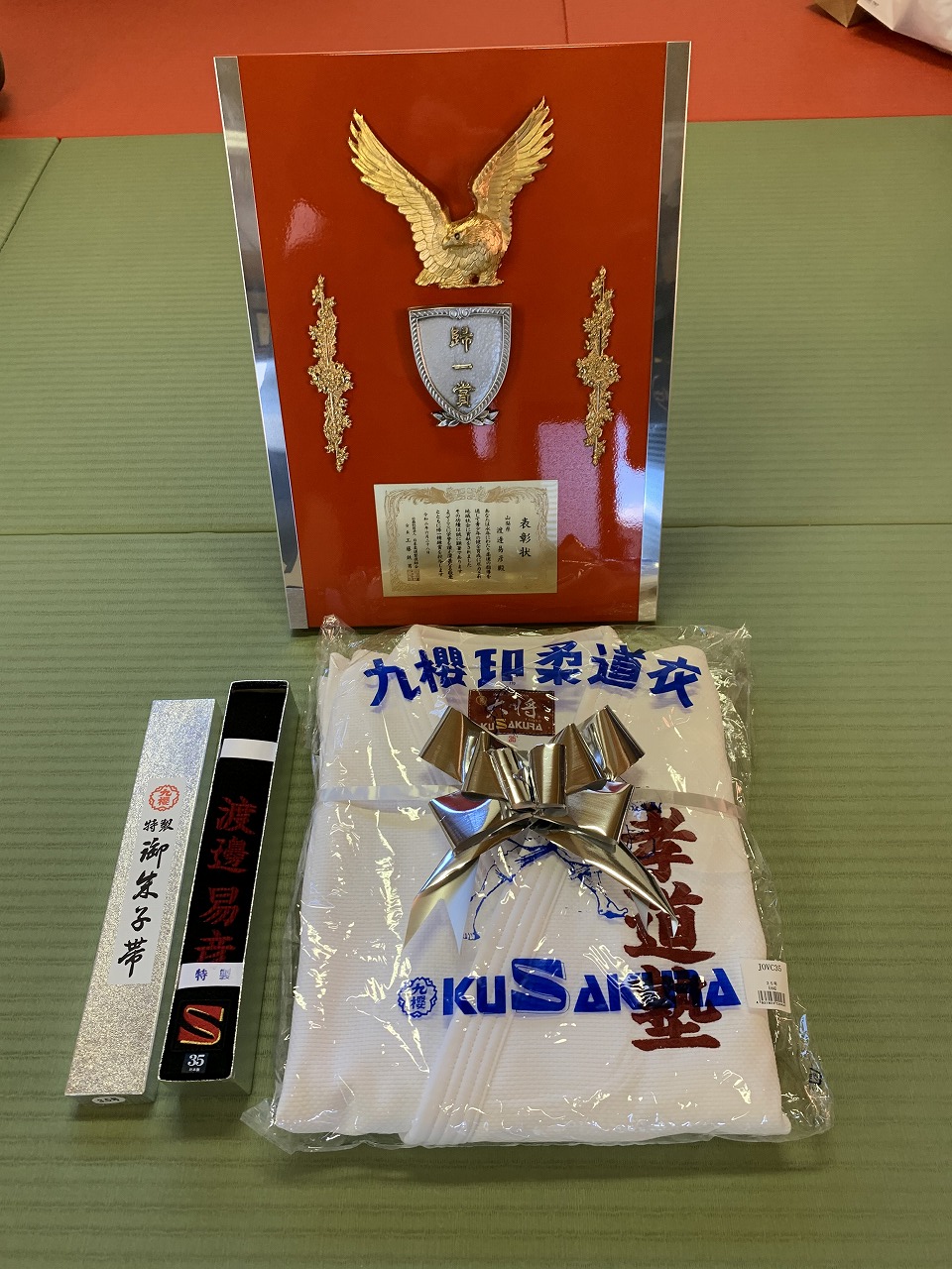 この日、開会式でサプライズで昨年頂いた小生の七段昇段のお祝いと帰一精錬賞受賞を祝って頂きました。コロナ禍での祝賀会は出来ませんでしたが、子供達から心のこもった日めくりカレンダーと還暦の赤字で刺繍した柔道着と黒帯を頂きました。